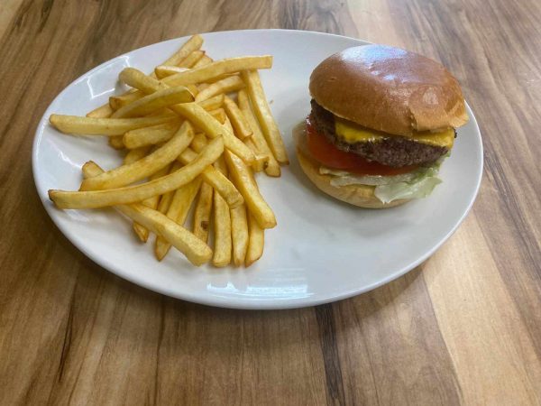 Formule burger : burger Classic (Ingrédients : Bun, steak de boeuf, cheddar, salade, tomates, sauce biggy burger) + frites.