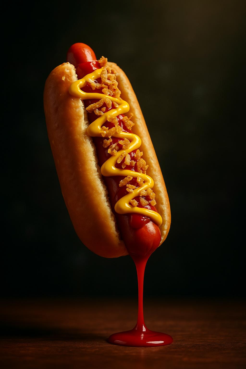 Ingrédients : Pain, saucisse, sauce américaine, ketchup, oignons frits.