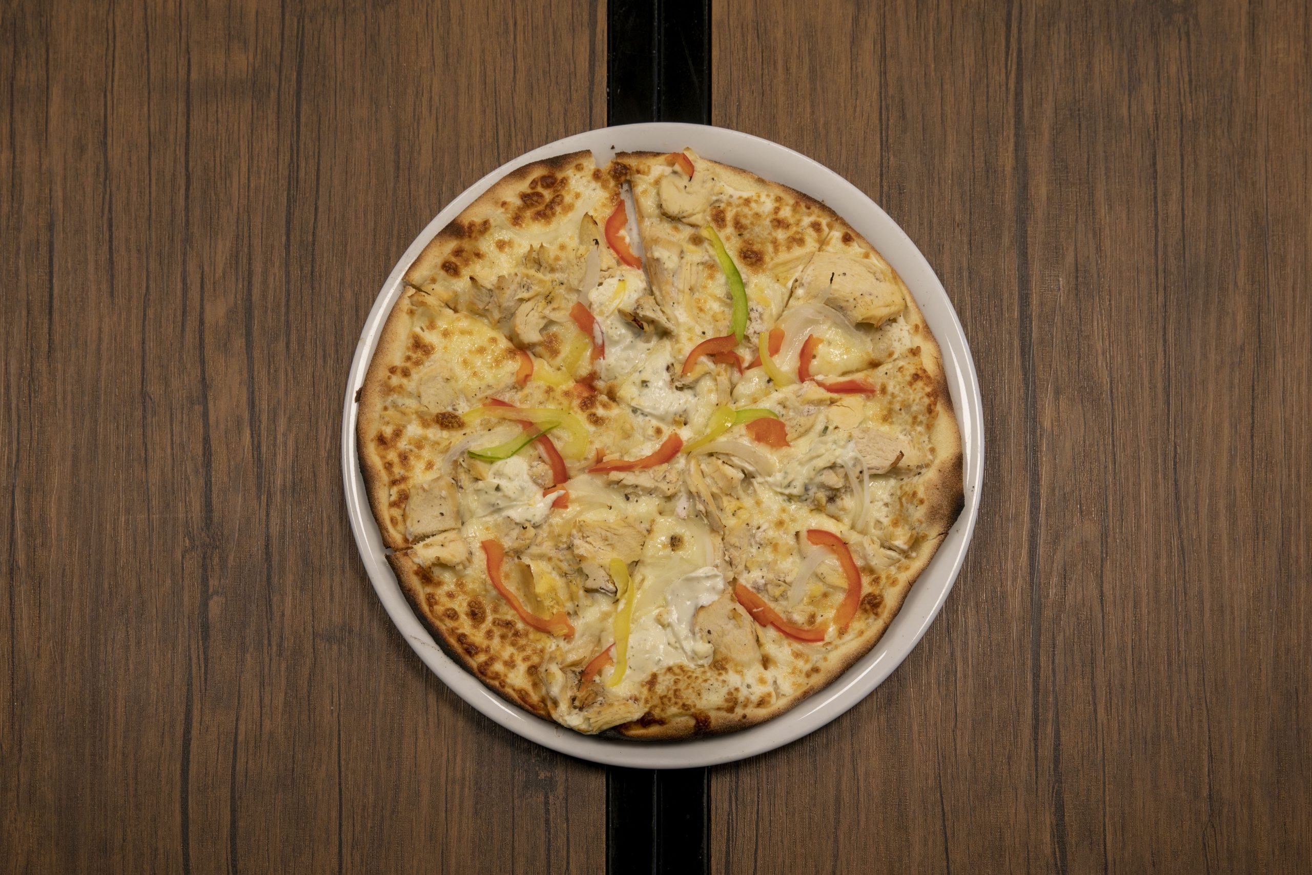 Ingrédients : Base crème fraîche, mozzarella, boursin, poulet, poivrons, oignons.