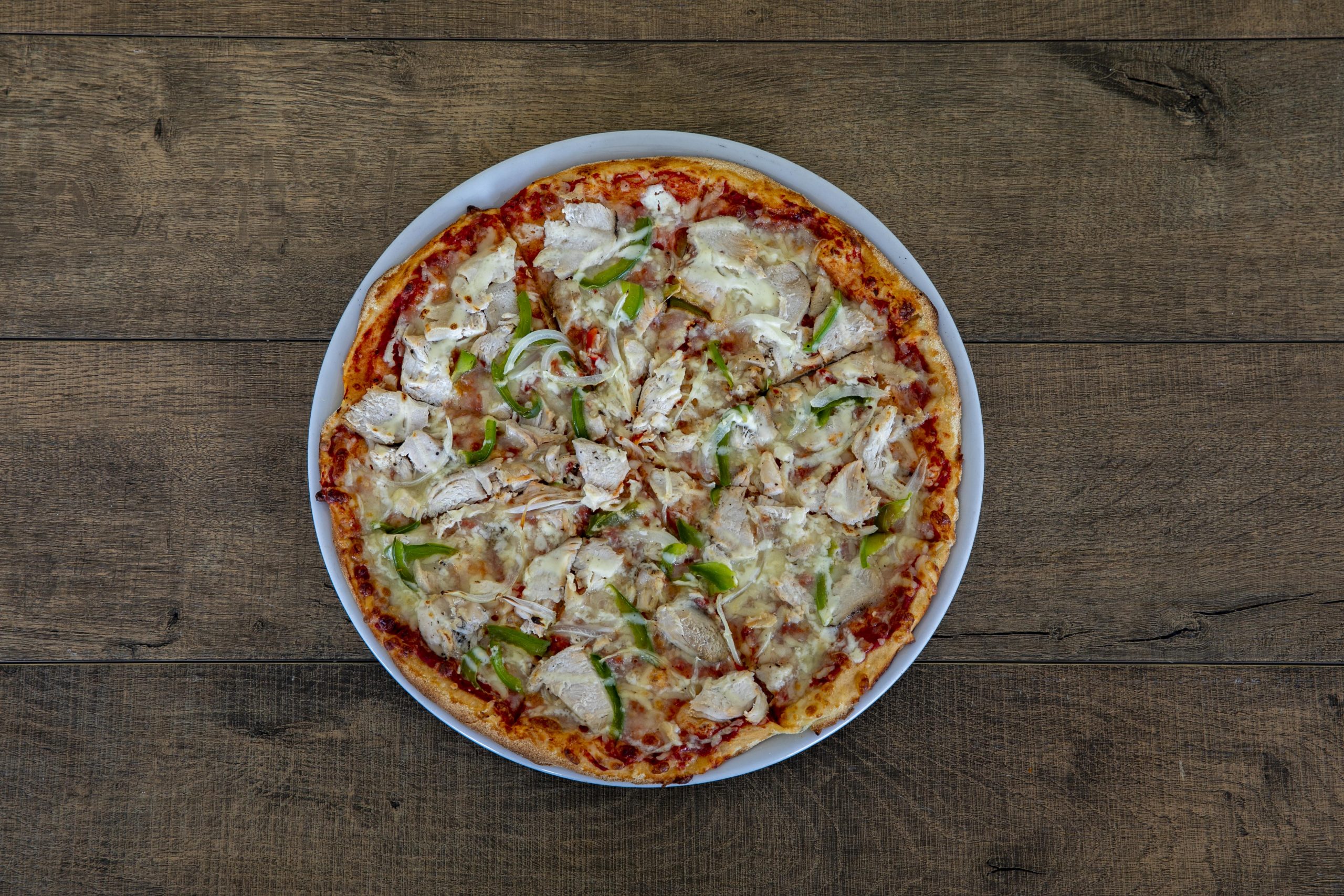 Ingrédients : Sauce tomate, mozzarella, poulet mariné, poivrons, oignons, crème fraîche.