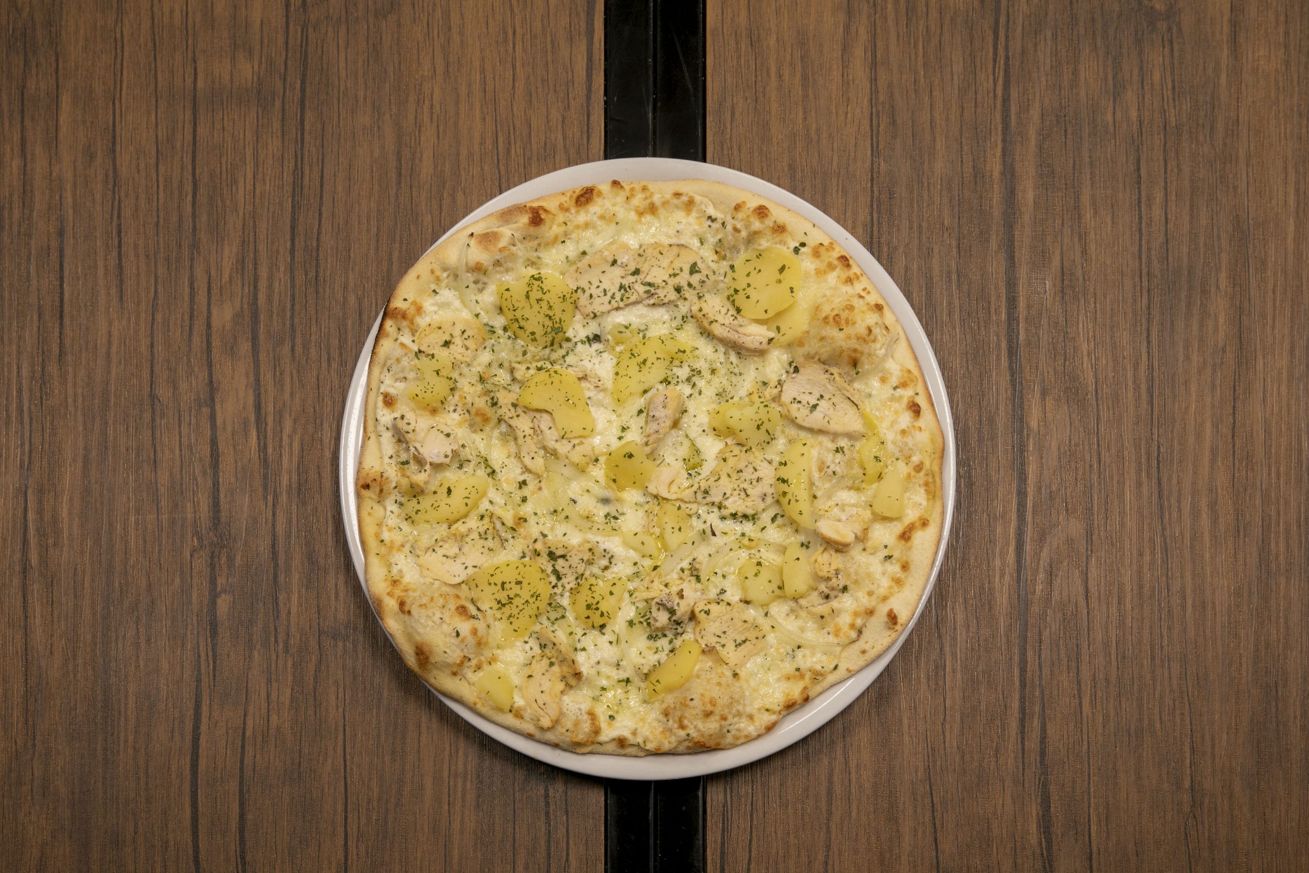 Ingrédients : Base crème fraîche, mozzarella, ail, fines herbes, poulet, pommes de terre, oignons.